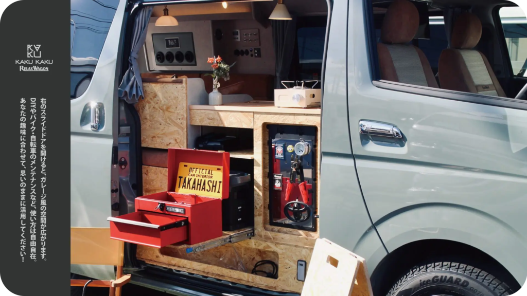 運転席側のスライドドアを開けると、まるでガレージのような空間が広がります。