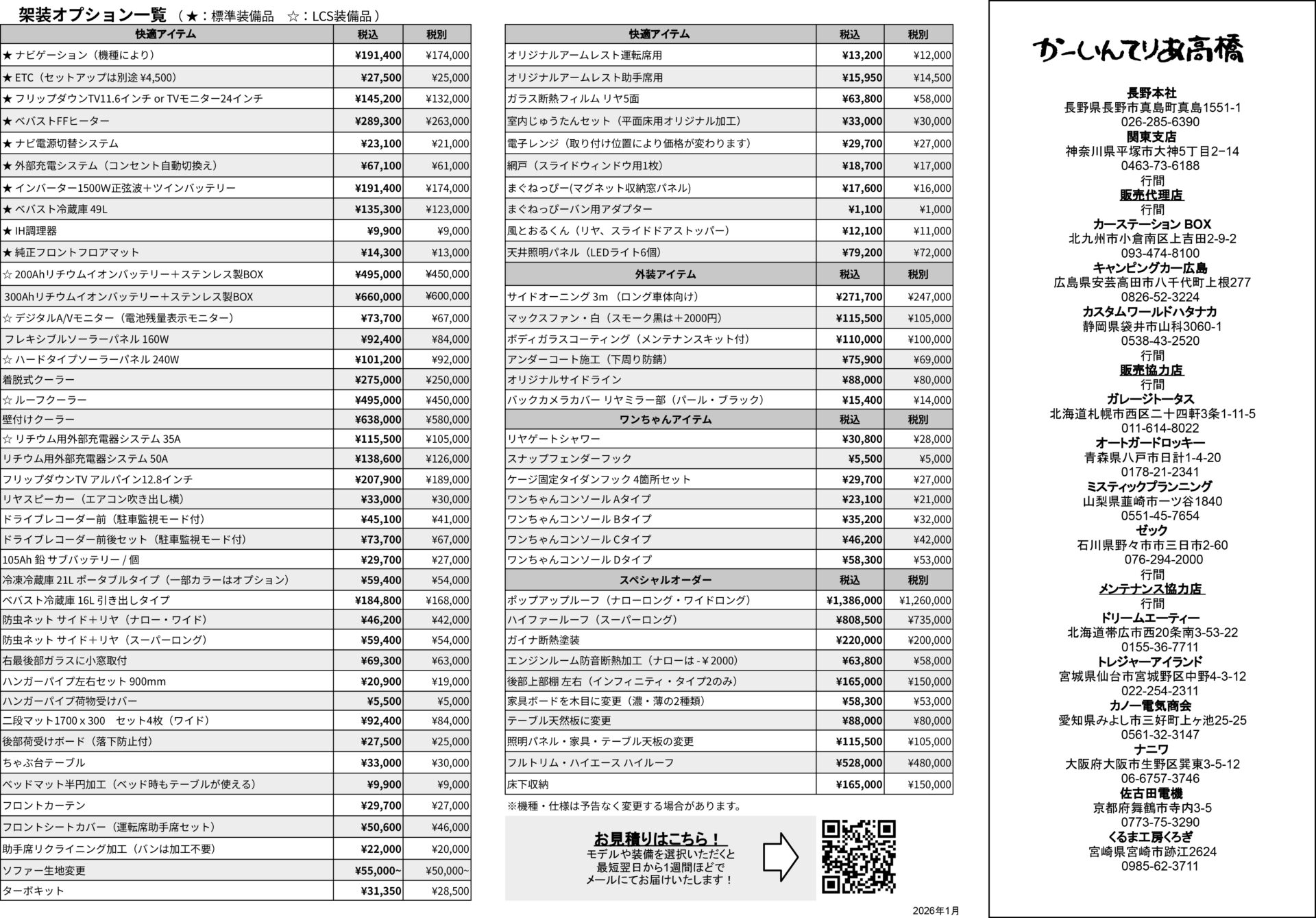 | リラックスワゴンタイプ1 + LCSパッケージ | ¥ 7,590,000 – (税込) ¥ 6,900,000 – (税別) | ¥ 7,898,000 – (税込) ¥ 7,180,000 – (税別) |